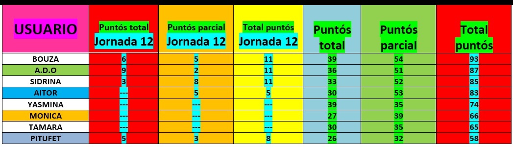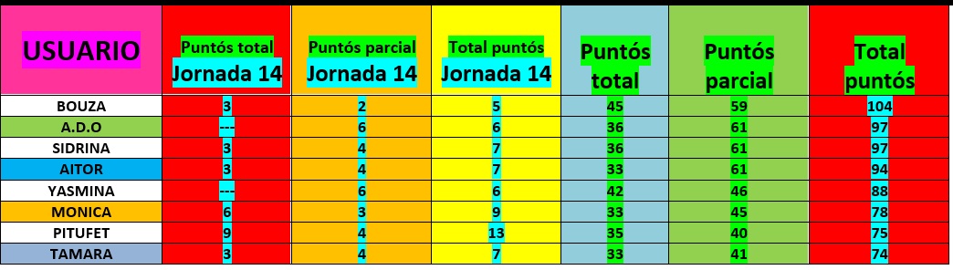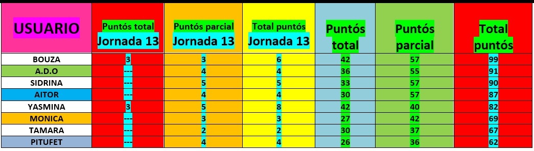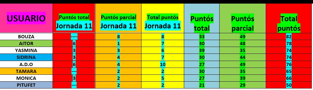 Recordad que son TRES puntos por acertar el resultado completo del enfrentamiento y UN punto si solo se acierta un resultado.